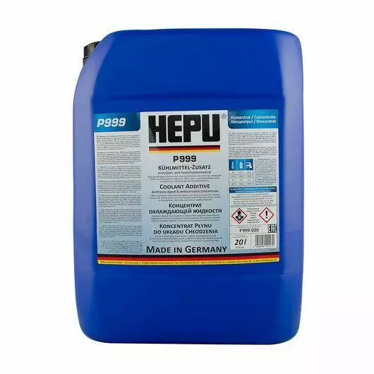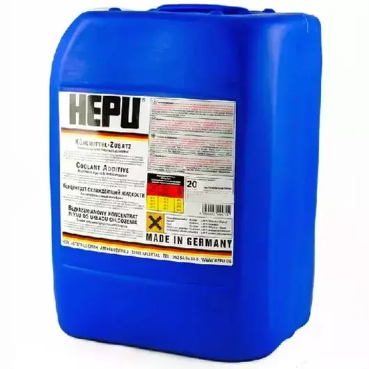 Синій преміальний антифриз HEPU P999-020 (Німеччина) класу G11 з температурним режимом -38°C і об'ємом 20 л. Являється концентратом, призначеним для змішування з дистильованою водою. Концентрована охолоджуюча рідина універсального застосування. Захищає від замерзання, перегріву, корозії та освіти відомого нальоту. Предназначен для алюминиевых и чугунных двигателей. Не містить нітритів, амінів і фосфатів.