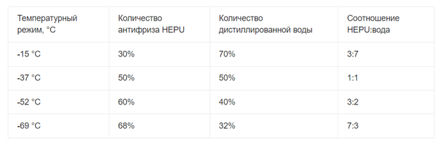 Таким образом, температурный ражим концентрата антифриза HEPU может быть от -69 °C до -15 °C.