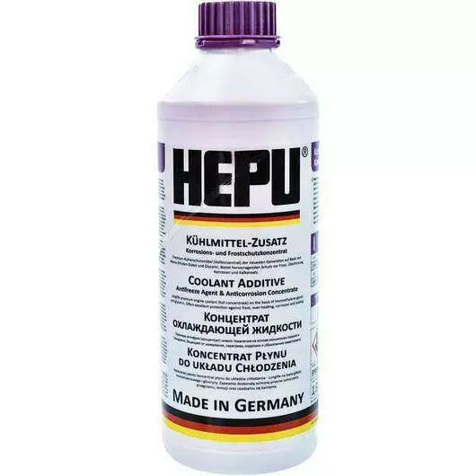Фіолетовий концентрат антифризу HEPU G13 P999-G13 (Німеччина) класу G13 з температурним режимом -38°C і об'ємом 1,5 л. Являється концентратом, призначеним для змішування з дистильованою водою. Концентрована охолоджуюча рідина універсального застосування. Захищає від замерзання, перегріву, корозії та освіти відомого нальоту. Предназначен для алюминиевых и чугунных двигателей. Не містить нітритів, амінів і фосфатів.