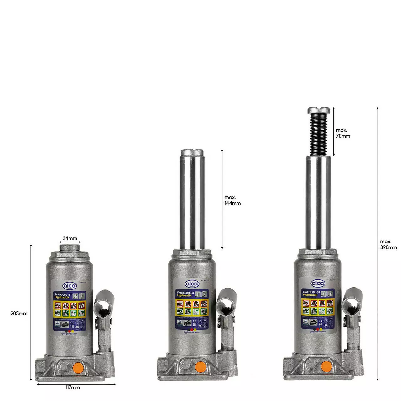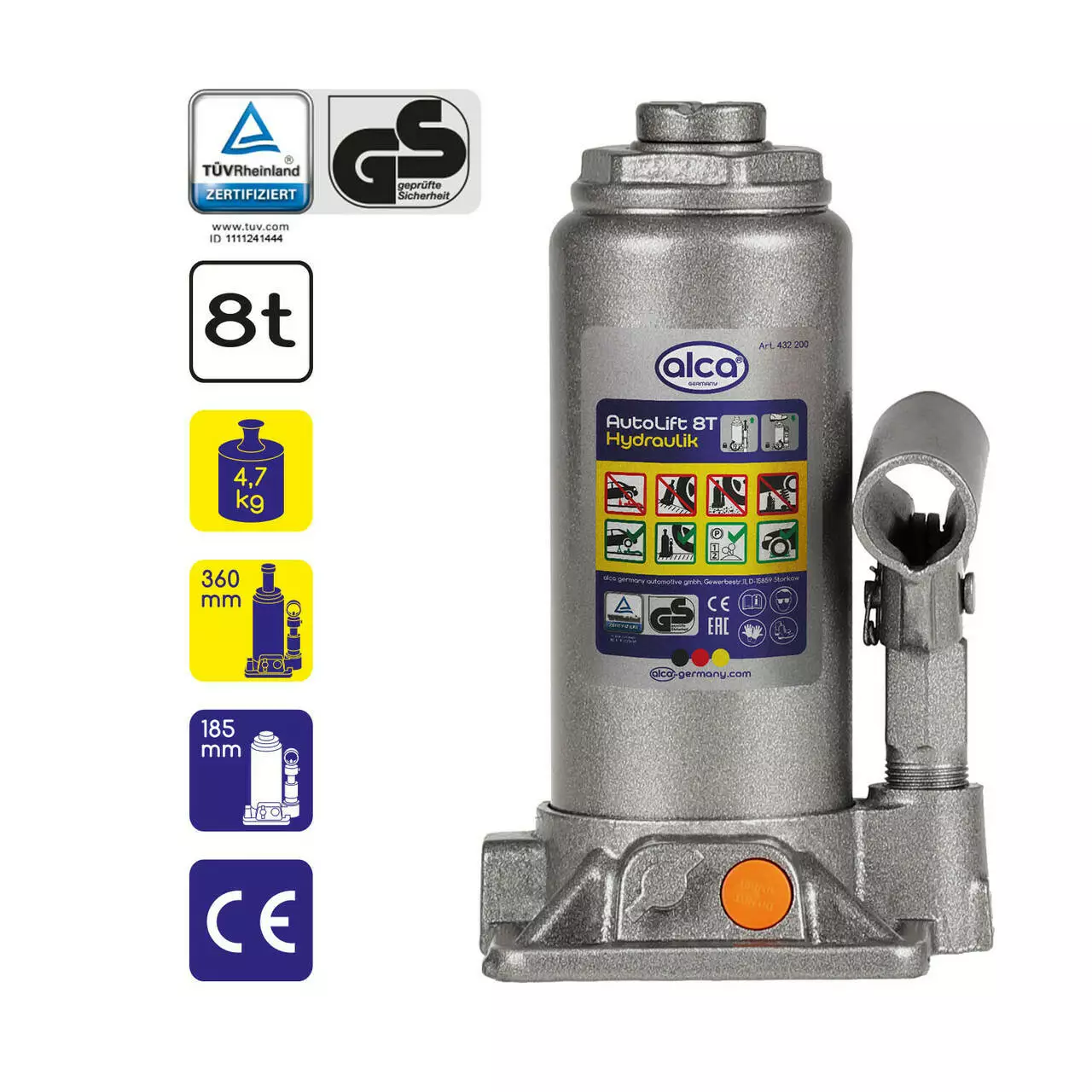 Гідравлічний домкрат ALCA 8 тонн є автомобільним аксесуаром, який є надійним інструментом завдяки своїй особливо міцній якості та відмінній керованості та стабільності.