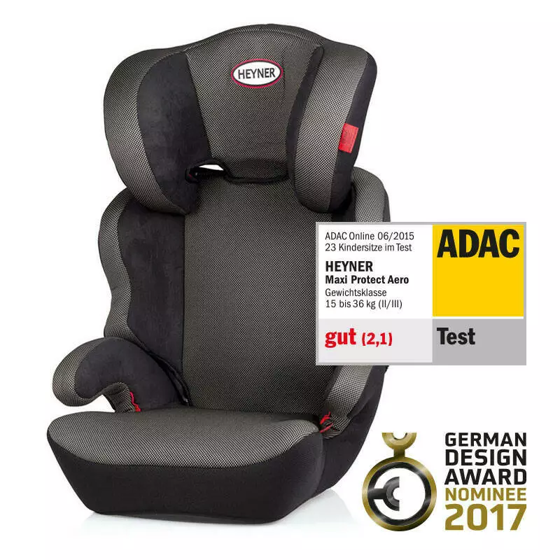 Дизайн та Кольори: Heyner MaxiProtect Aero SP доступне у кількох кольорах: чорному, сірому, синьому, червоному, бежевому, коричневому. Здобуте автокрісло відповідає найновішому Європейському стандарту безпеки ECE 44/04 та отримало престижну нагороду GERMAN DESIGN AWARD SPECIAL 2017.